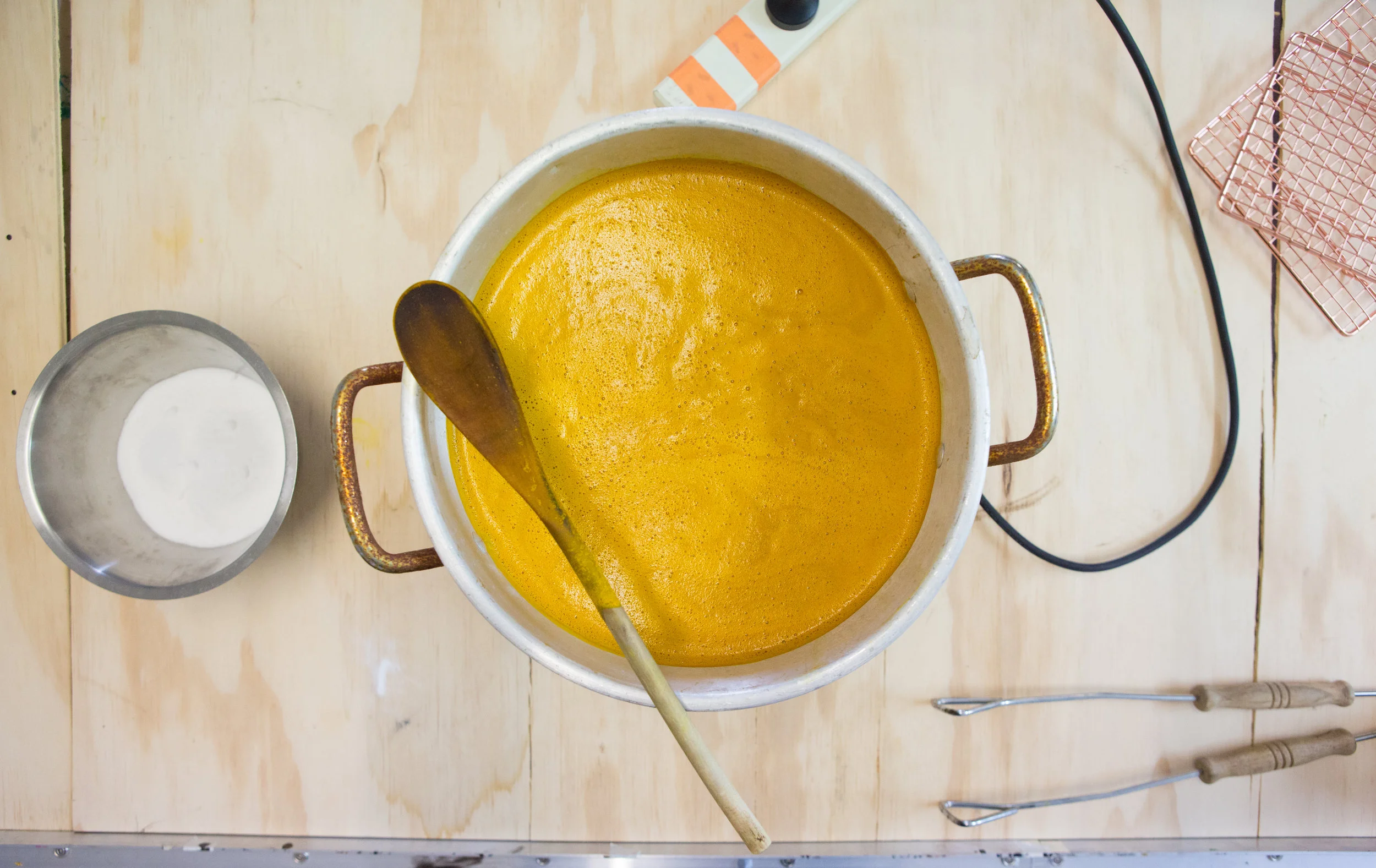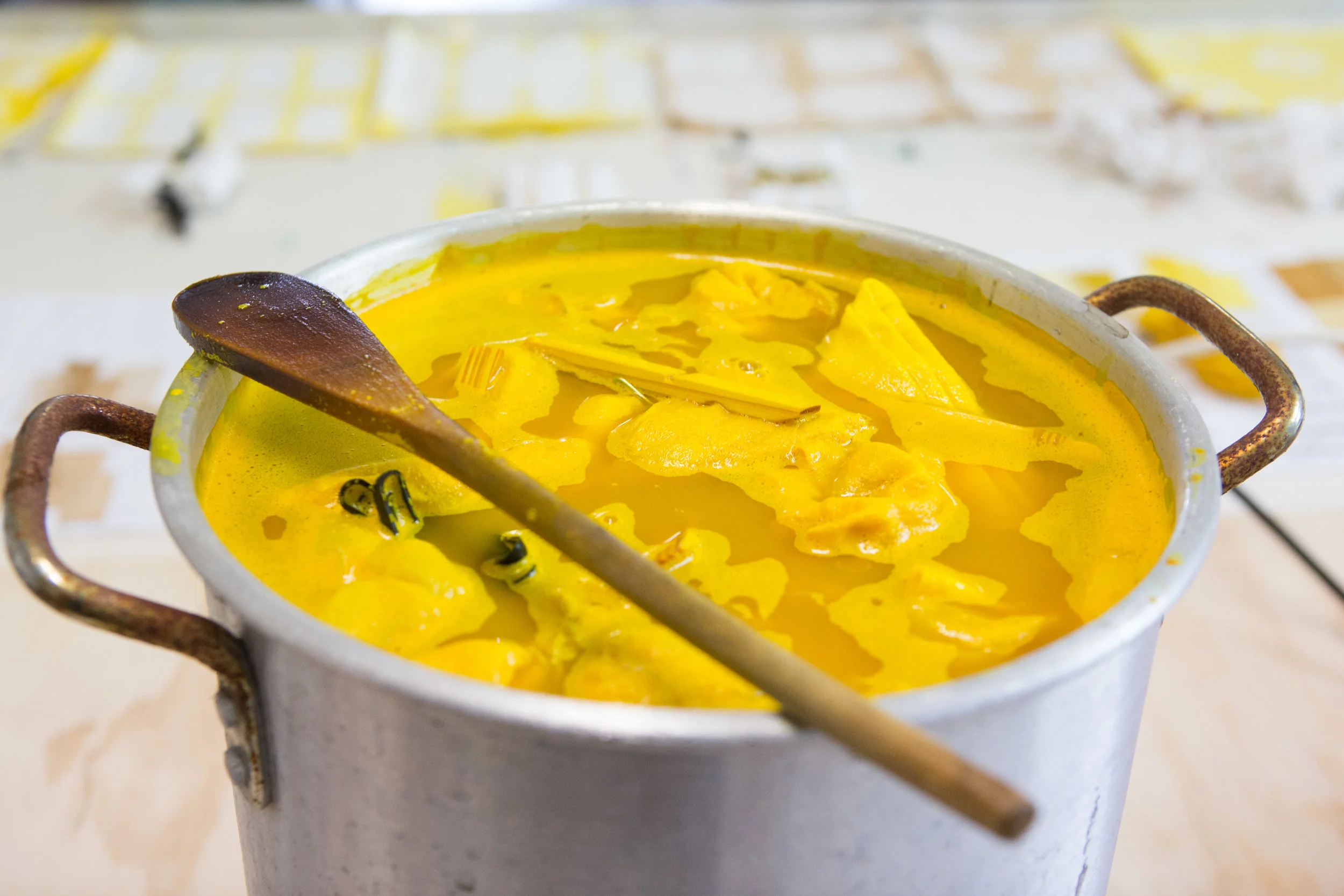 The simplicity of plant-dyeing becomes obvious as we secure our cloth with a random assortment of household items - paddlepop sticks, rubber bands, string and cotton thread. We pre-soak the folded cloth and then, lower our creations carefully into the dye-bath; one cup of turmeric to six litres of water, plus a cup of salt to act as our mordant. The bath then goes over a low to medium heat.