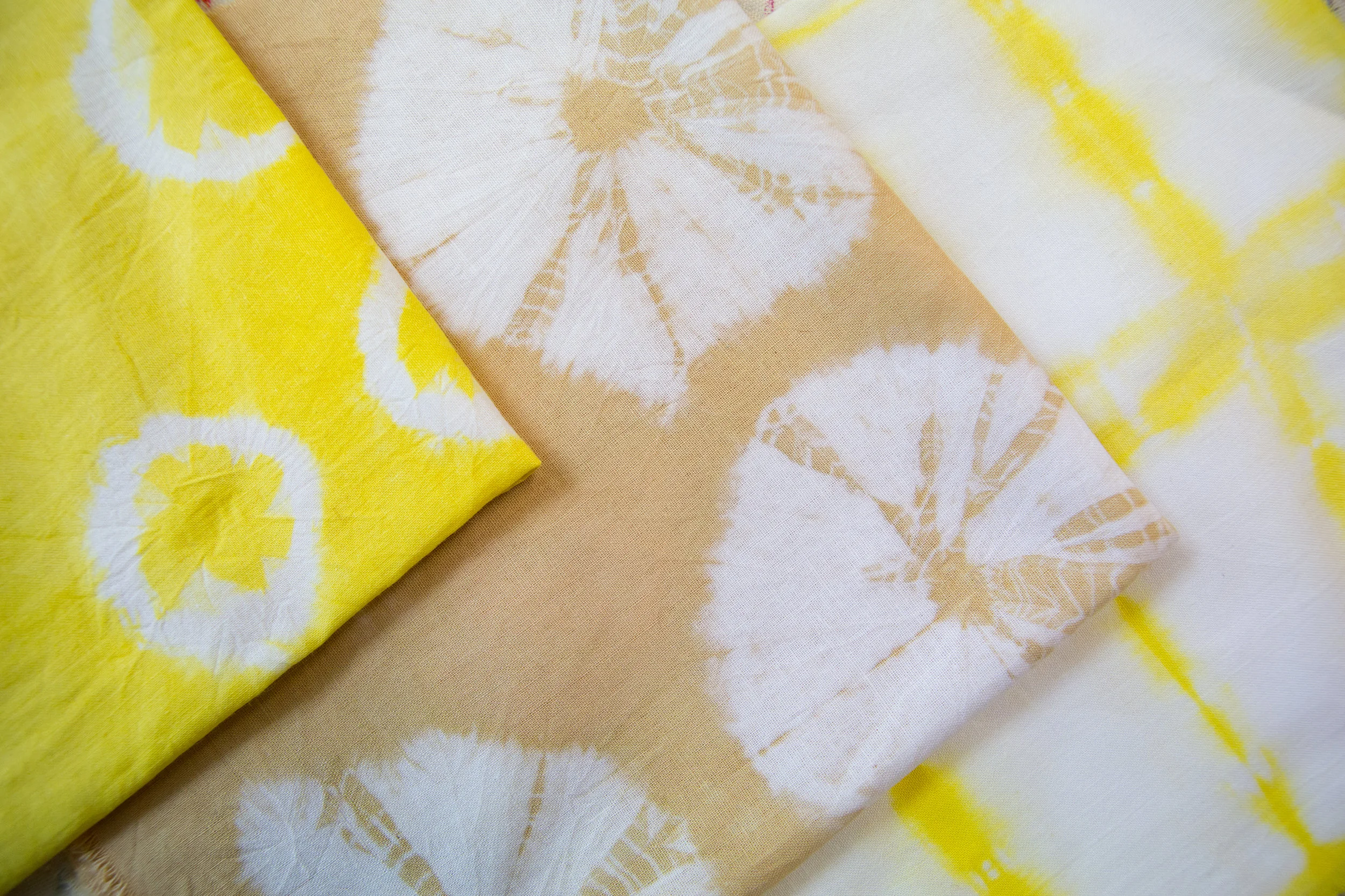 As we pull our turmeric soaked, carefully folded and twisted bundles from the dye-bath, an air of excitement hangs in the air. What delights will our brightly coloured parcels reveal?